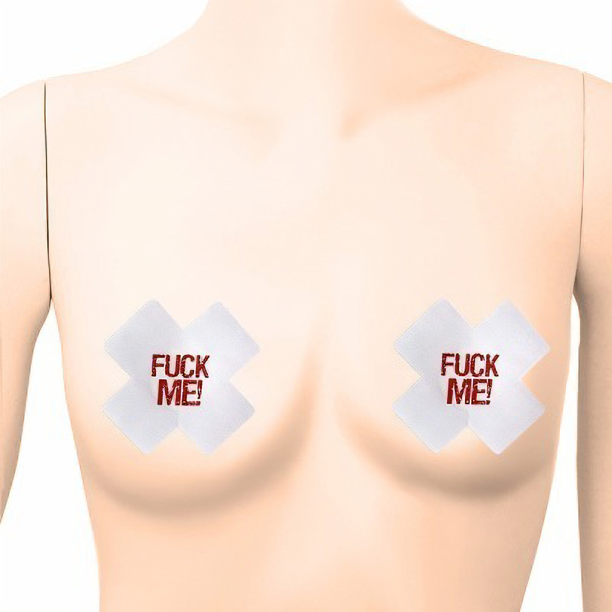 こんな風に主張されたらたまらない!「FUCK ME!」と大胆にアピールする2枚1セットのニップレス(白)。バッテン型のニップルシールが貴方の秘めた想いを叫ぶ!乳首に触れる中央部分には肌保護として粘着しない素材を使用しています。擦れ・透け防止にも◎