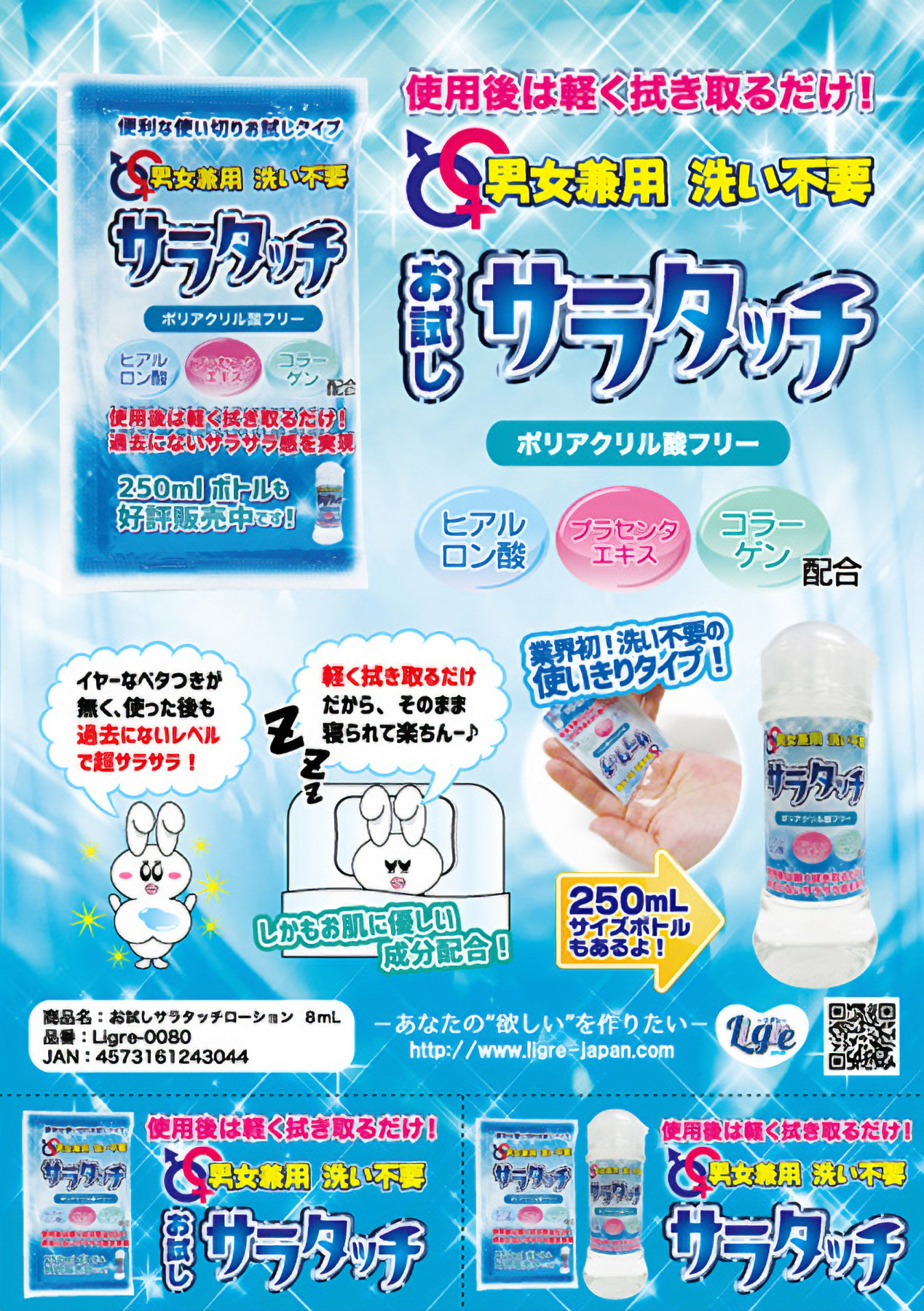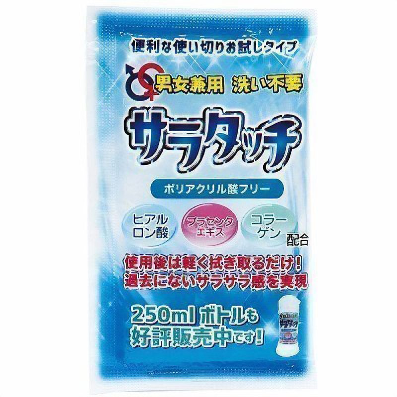 拭き取るだけで綺麗さっぱり♪「男女兼用 洗い不要サラタッチ」の使い切りサイズが登場。ヒアルロン酸やコラーゲンといった保湿成分ほか、肌に優しい成分を配合したローションはサラッとした瑞々しい質感で使い心地抜群!乾くとカピカピになる成分が一切入っていないため、ストレスフリーでお使いいただけます。お試しには勿論、パウチ仕様なので携帯用としても便利!