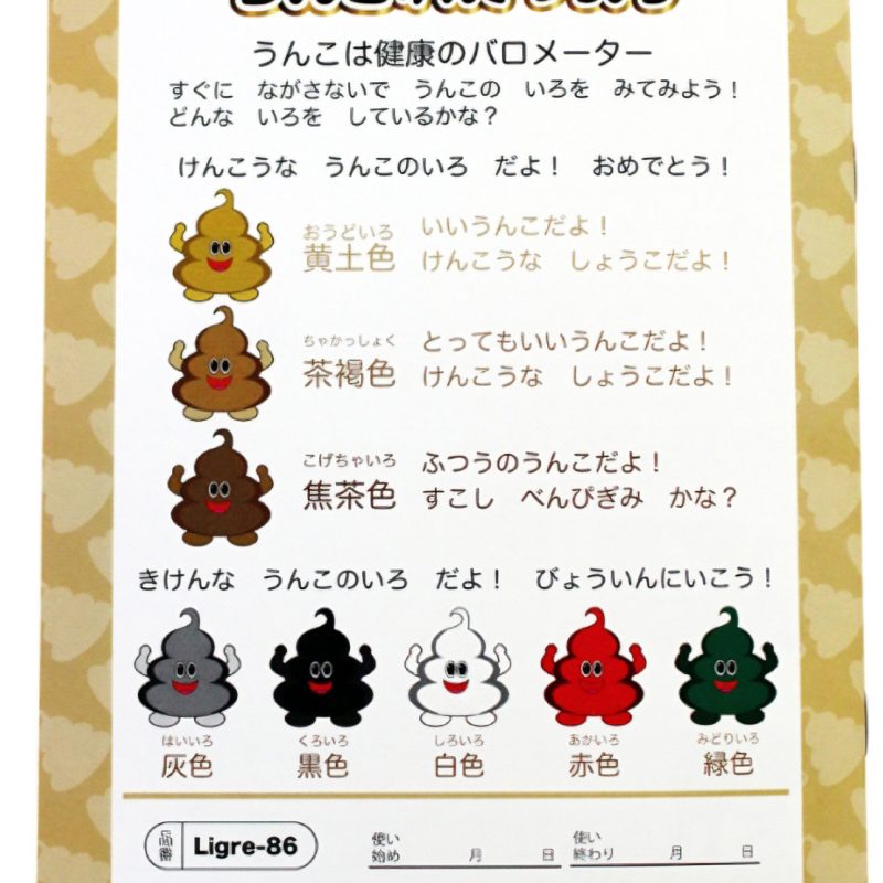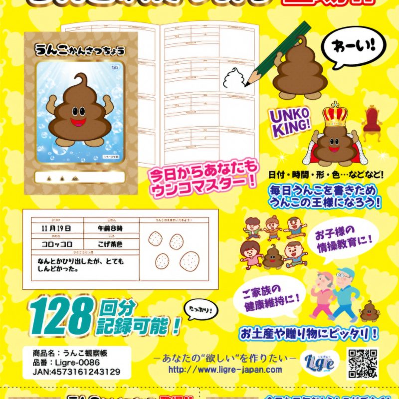 毎日の体調管理にうんこ日記をつけよう!日付、時間、うんこの形や色などの状態管理用の項目のほか、ひとこと日記など一冊で128回分の記録が可能♪夫婦やカップルさん、家族みんなが毎日元気でいるために。今日からうんこ日記を始めよう!
