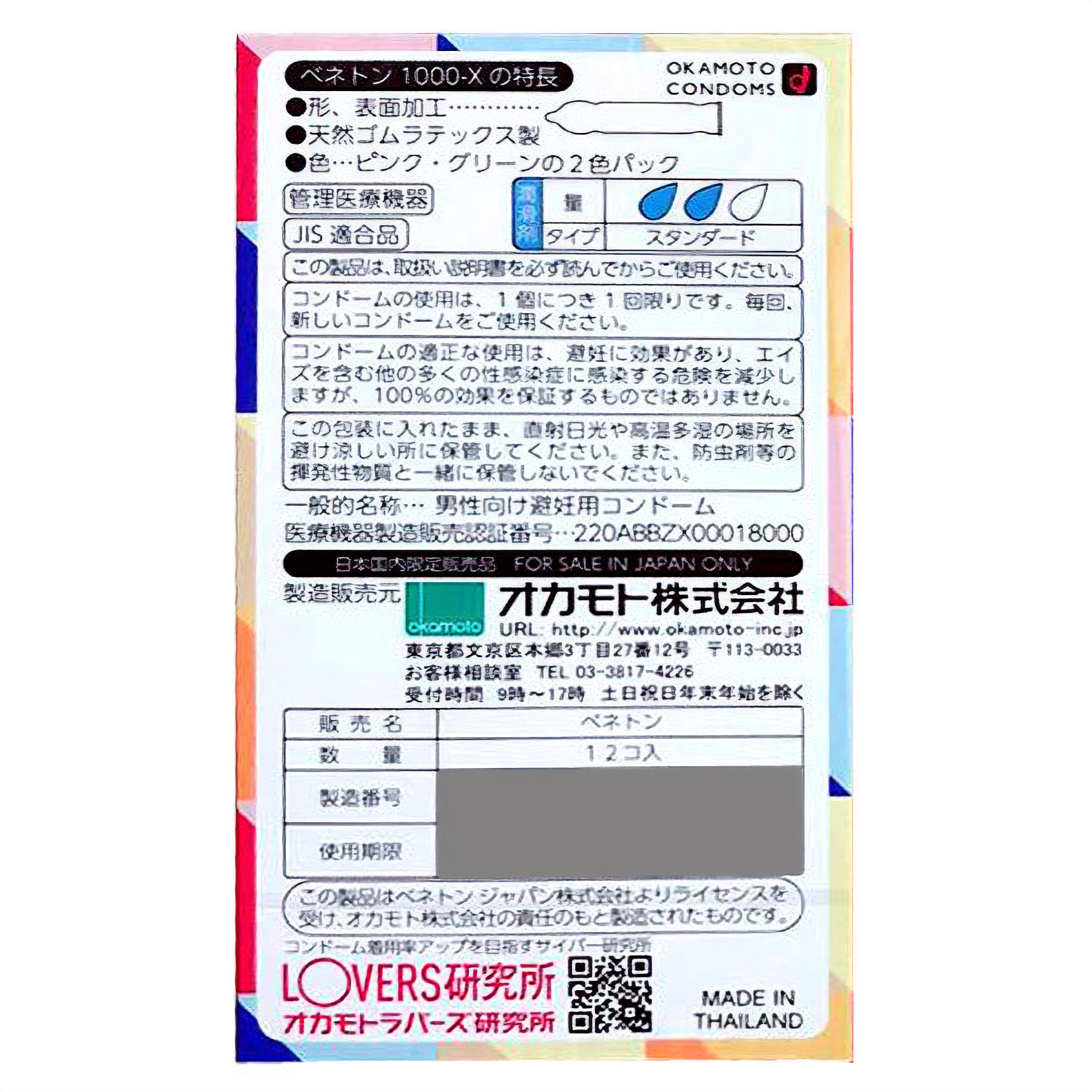 鮮やかなマルチカラーが目を引くオシャレパッケージ!イタリアの有名ブランド「ベネトン」とコラボした、ファッショナブルなオカモト製コンドーム(12個入り)。ジェルがたっぷり塗布されているので、装着も挿入も手間取らずにスマート!個包装パッケージにもベネトンのロゴマーク入りなので、クールにキメたい夜にピッタリです。ピンクとグリーンの二色入り。