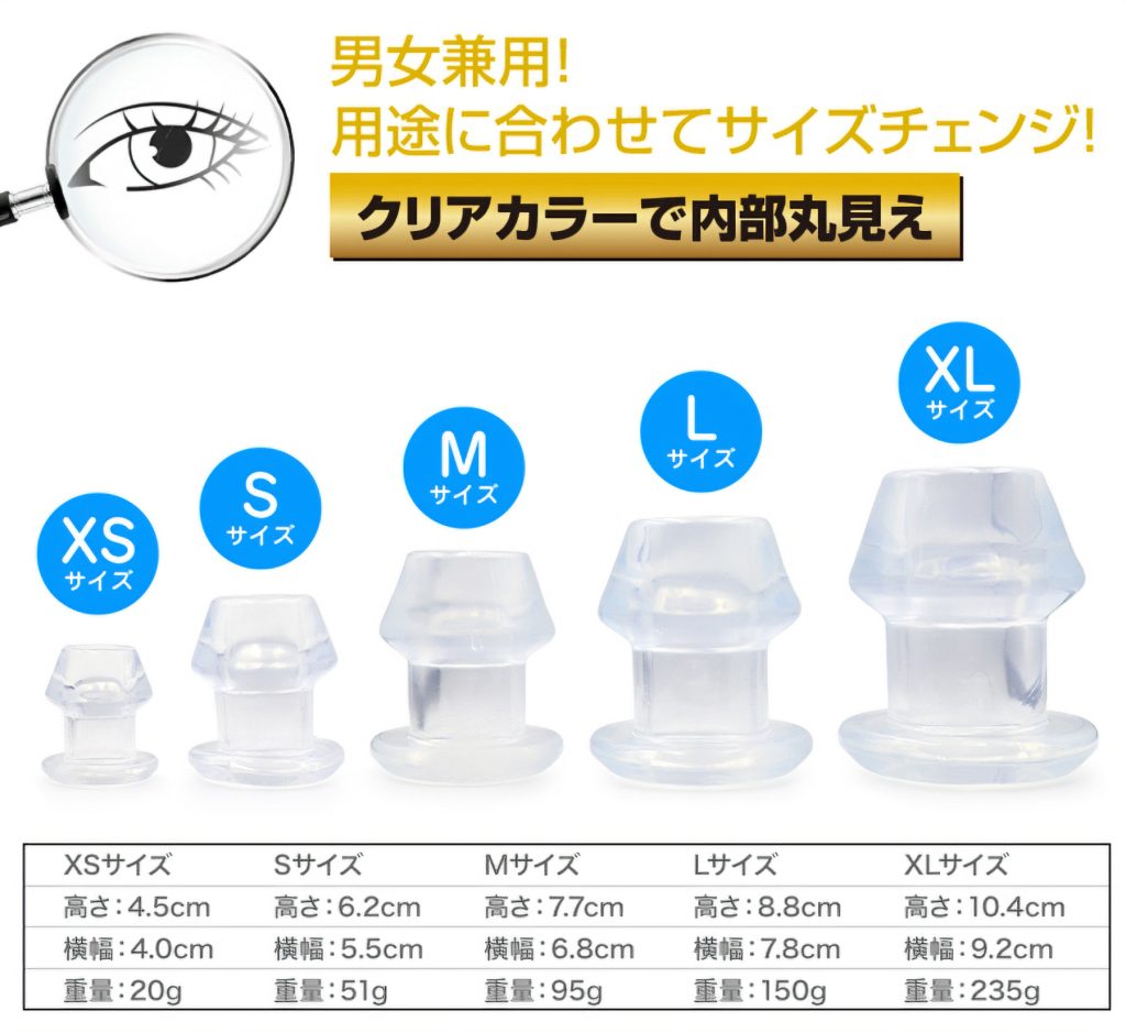 男女兼用!用途に合わせてサイズチェンジ!内部穴360度見渡せる極上の光景幅広いプレーが可能な多用途プラグ柔軟性と形状保持力を備えた透明色の拡張アイテムです。拡張プレイだけでなく観賞や洗浄、ローション注入等、幅広く活用できます。5サイズ展開はレディース、メンズ、初心者、上級者と使い分けが可能。ご自分の判断でご利用ください。素材:TPRサイズ:Sサイズ全長:62mm 最大幅:50mm(底部を除く)空洞内径:24mm