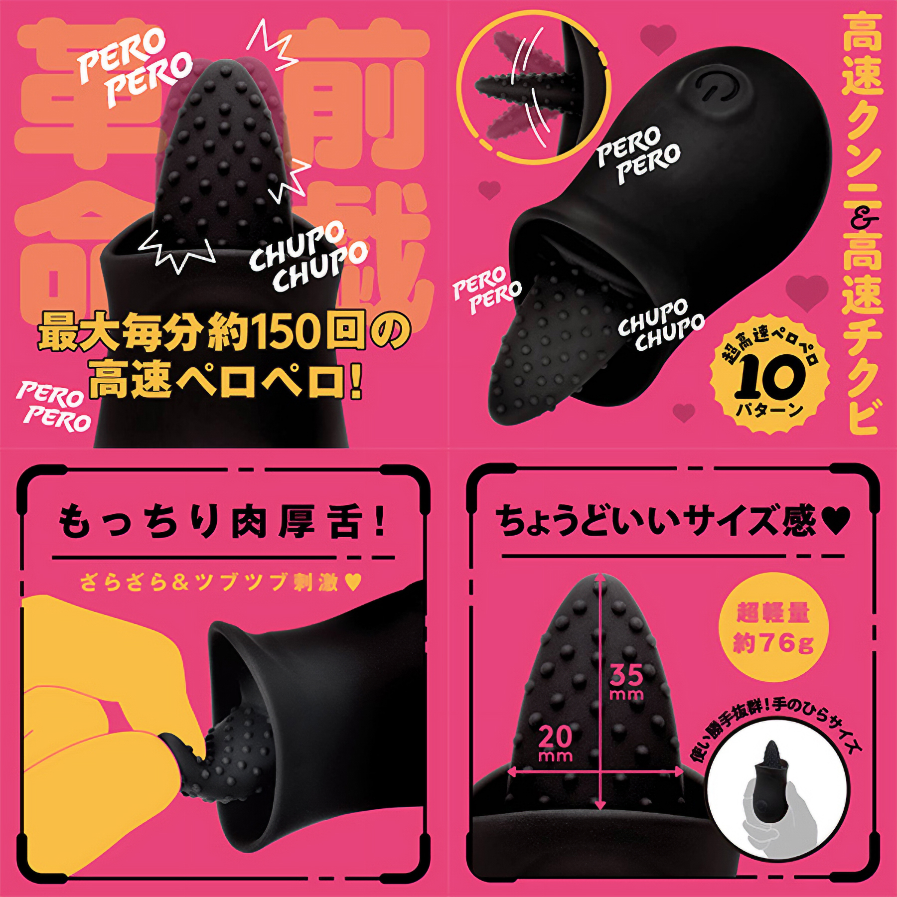 高速舌舐めローターでクンニイキ&チクビイキ!高品質ソフトシリコンを使用した肉厚舌は、もっちり弾力で、表面のツブツブがとても刺激的!ちょうどいいサイズ感の舌は、中も外もイケる万能舌です。マンネリしない多彩な高速ペロペロ10パターン!最大毎分約150回の高速ペロペロ!防水機能IPX6等級。静音設計 ≦60dB。●カラー:ブラック