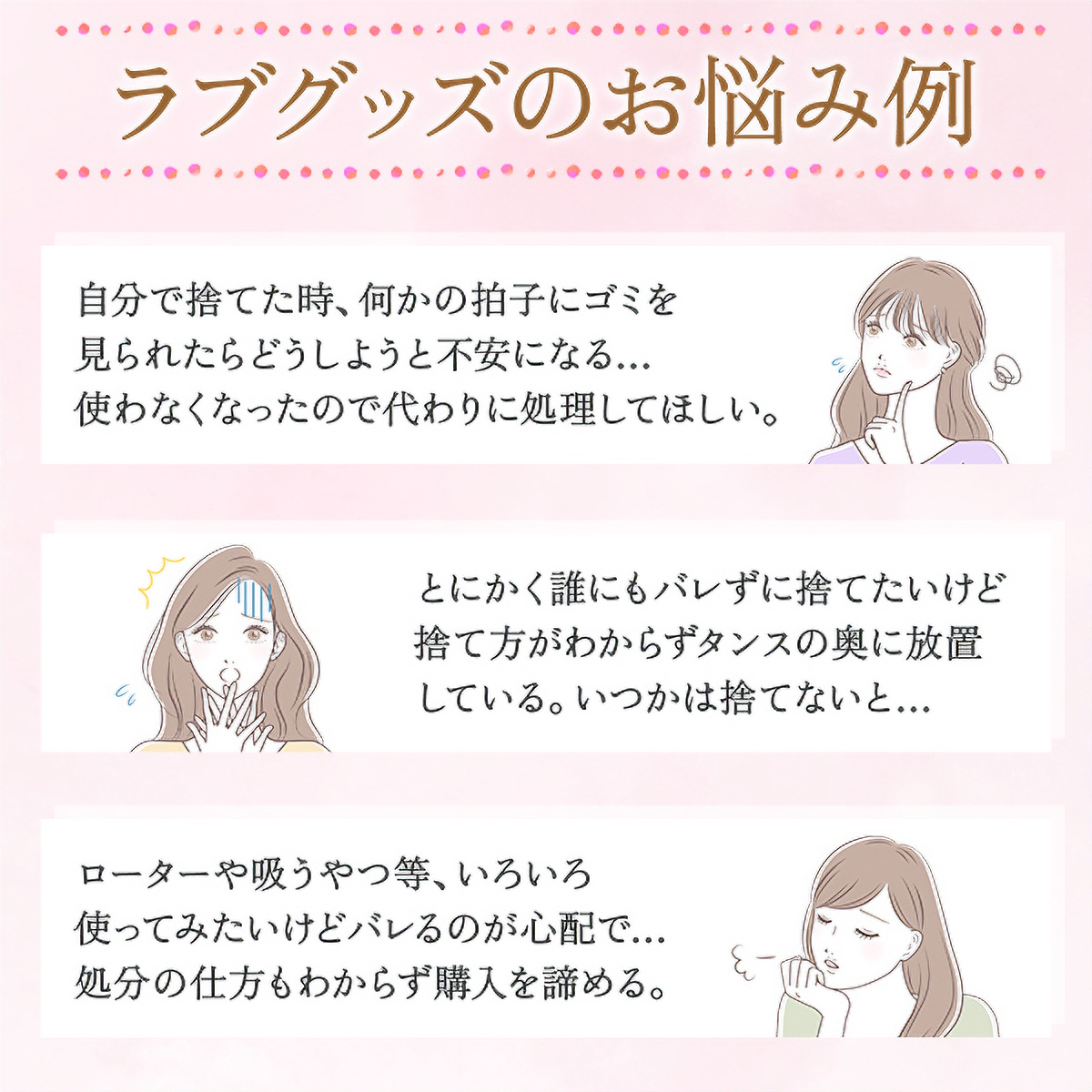 ラブグッズの処理に困った事はありませんか? その悩み、解決します!「アダルトグッズ、大人のおもちゃに興味はあるけど、捨て方がわからないし、一般のゴミと一緒に捨てた場合、万が一中身を見られたら…と考えると不安で買うのを諦めます」といった人もいるのでは?長年の販売実績と徹底したプライバシー管理。誰にもバレずに捨てたい人は当店にお任せ!ローター、バイブ、ディルドに電マ、勿論女性だけでなく男性の方もご利用頂けます。オナホ等、処理に困ったら是非ご利用下さい。※発送の手順を同梱しておりますので、必ず手順に従ってお送りください。※一回の購入に対して一度のみご利用可能です。また、同梱している伝票以外の荷物は受取り出来ませんのでご注意下さい。